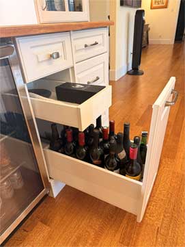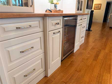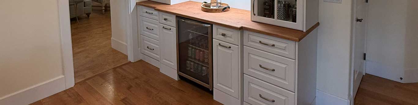 The clients wanted a Dry Bar that matched the door style, crown and countertops in the nearby kitchen. The design was a creative collaboration that achieved the look and features the clients desired.