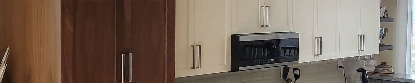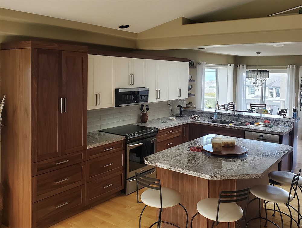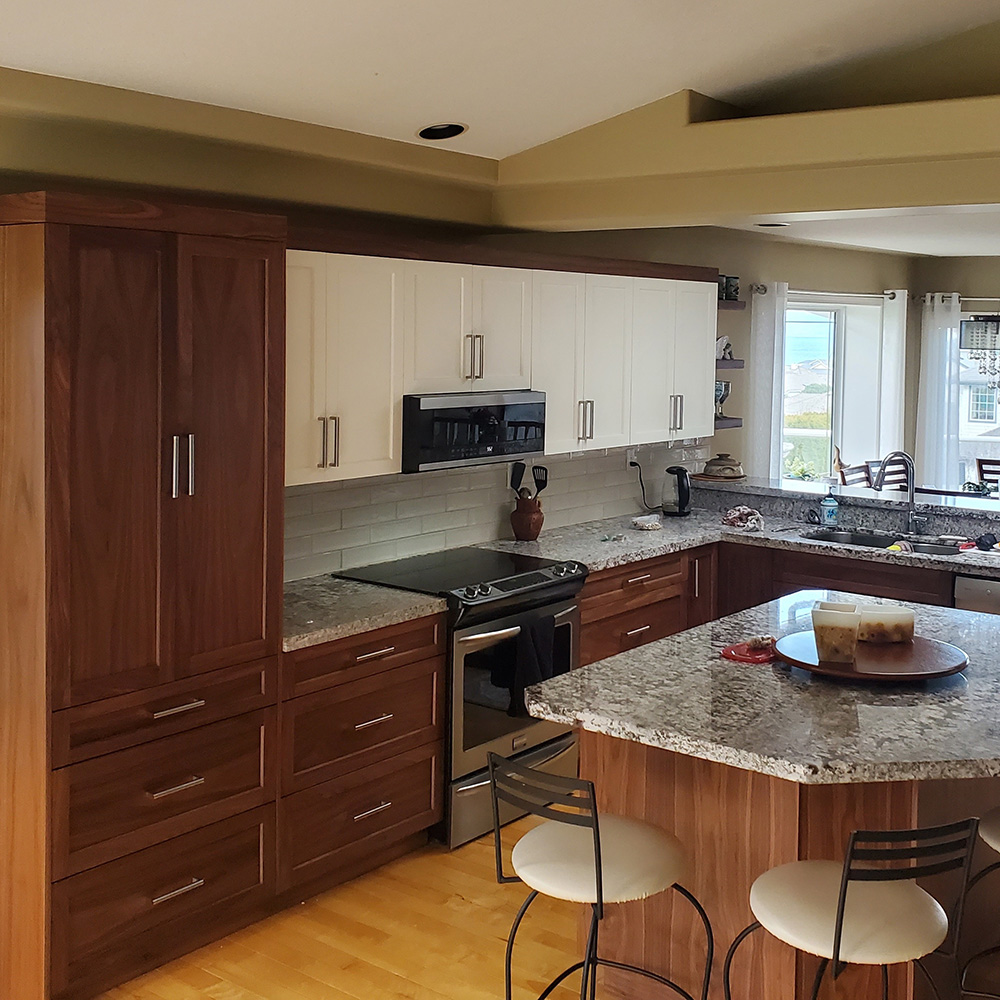 The clients wanted to drastically change the look of their old kitchen without the extra cost of doing a full kitchen replacement. All the old boxes were left in place and a tall pantry was added. Concerned that black walnut would darken to kitchen, we introduced off-white uppers and added the unifying walnut crown.